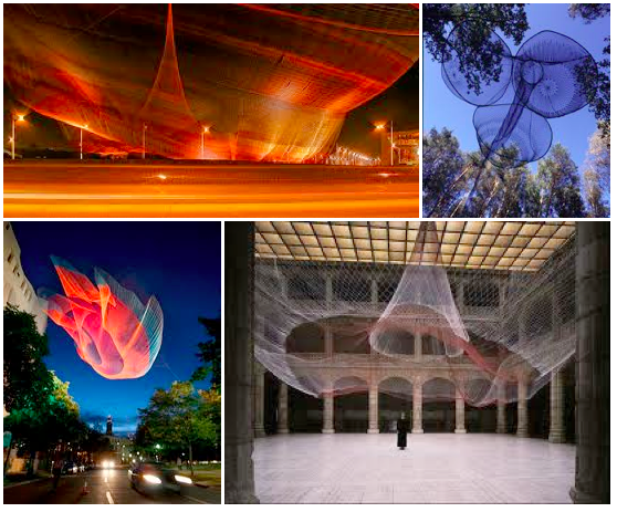 Beyond the world of fashion, other artists have been reinventing lace, rethinking it’s role in culture beyond typical adornment. In 2007, the Museum of Arts and Design in NYC held an exhibition called Radical Lace & Subversive Knitting which explored the resurgence of these crafts in contemporary art. These artists re-evaluated the technical aspects of lace and reinterpreted what lace can be based on its construction (creating interlocking structures in patterns that permit light to pass through them). I think one of the more interesting artists was Janet Echelman who often incorporates lace-making techniques to create large-scale installations that interact with their environments.