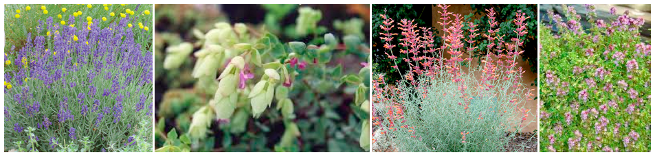 Beyond the hens & chicks (2nd from the right) which are great for rocky terraces, flax, Spanish Gold Broom and Sage (left to right) are great water-saving choices that still yield beautiful flowers. On High Country Gardens’ website they have a xeric garden package you can buy for $124 that includes 22 plants that are not only beautiful to look at but smell amazing as well (except to deer and rabbits apparently). They include lavender, flowering oregano, licorice mint and lemon thyme (left to right below). The agastache rupestris (licorice mint) also has the benefit of attracting hummingbirds. Who doesn’t love those little guys?