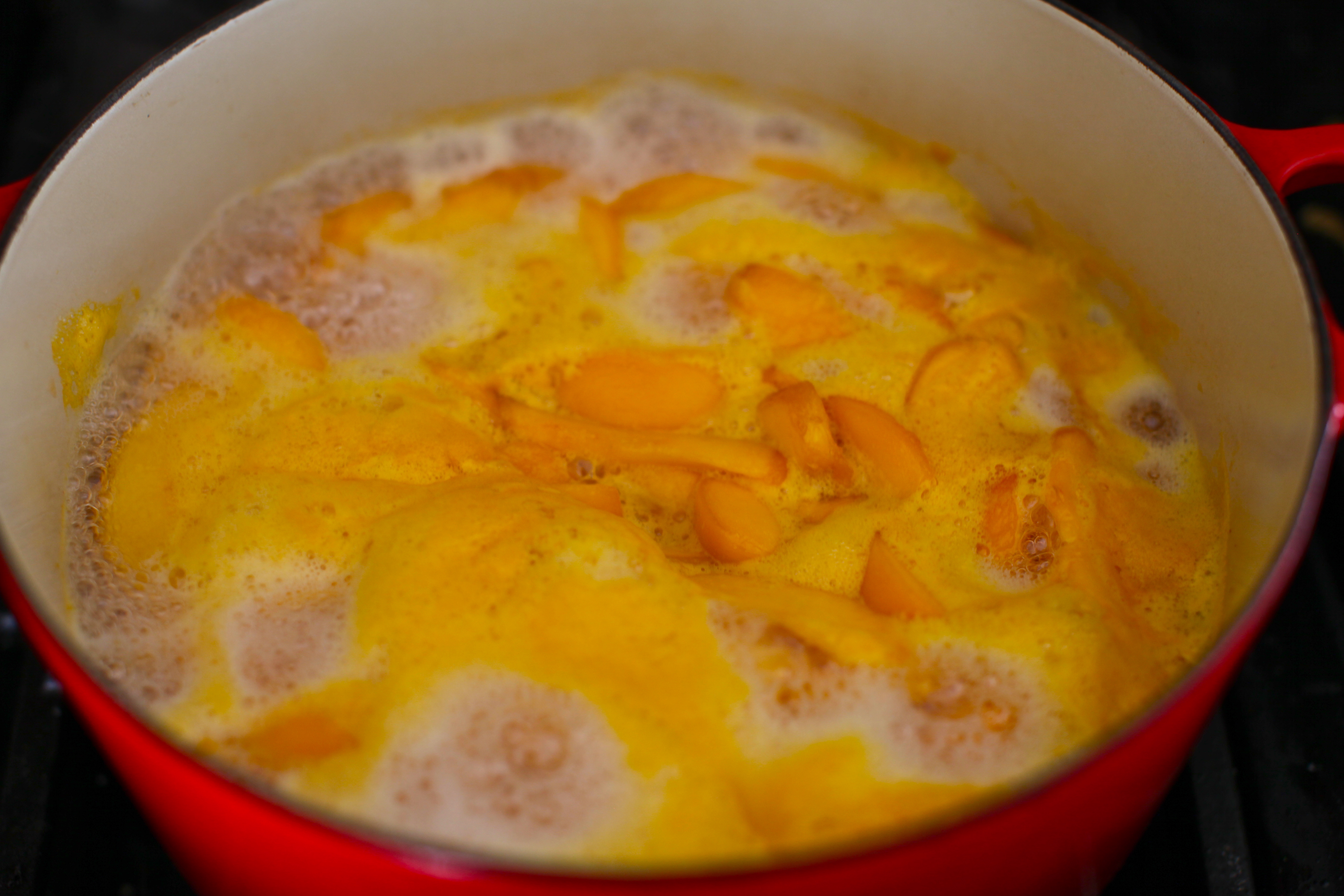 The next day bring to a boil for 5 minutes. Remove from heat and skim foam off the top. Using a potato masher, mash the peaches to break up the wedges a bit. It will further breakdown so you can do it later on to your taste. I like to still have chunks of fruit in my preserves. Bring back to a boil for 25-40 minutes until it thickens. For the basil peach preserves, add a bunch of fresh basil in as it is boiling. You can remove it before jarring. The way to test if it is right is to put a few spoons in the freezer, pull one out and put a little jam on it. Put it back in the freezer for 3 minutes. When you hold it up if it is runny it still needs more time boiling.