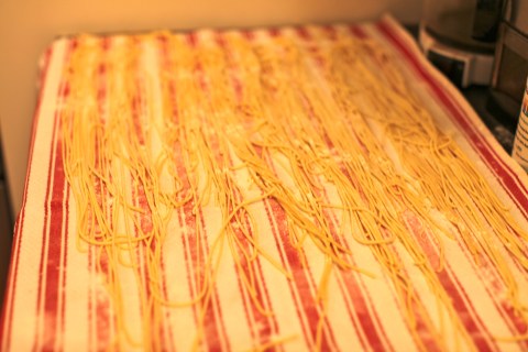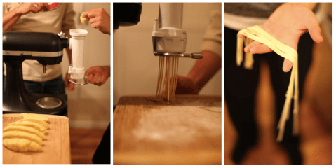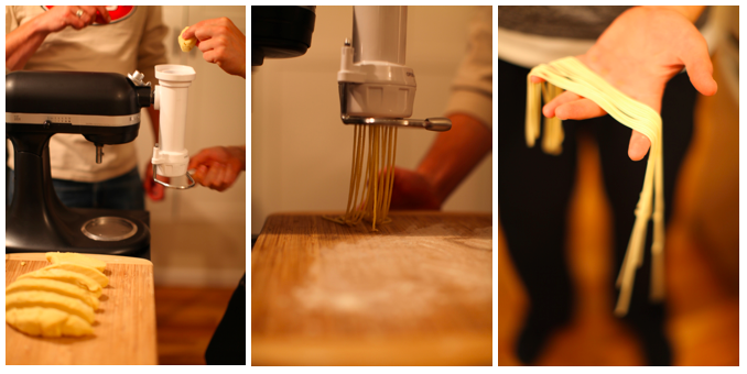 Somehow we found ourselves pushed out of the way by our husbands in terms of the spaghetti production. I guess it had the right amount of gadgetry to it. We were using my friend Jess’s KitchenAid attachment which makes it pretty easy. You just take small segments of dough, drop them in and the machine does the rest. You just cut it off when it gets long enough and set it aside on a dusted surface to dry a bit.