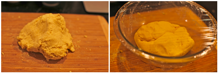 You take 2 1/2 cups of semolina and add 1/2 cup plus 1/3 cup lukewarm water. All purpose flour is good to have on hand for dusting. You start by mixing the dough and water until it is crumbly and then transfer to an un-floured surface to knead the dough for about 9 minutes until is is smooth and elastic. The dough then sits in a dusted glass container for 30 min covered. Now the past fun begins.