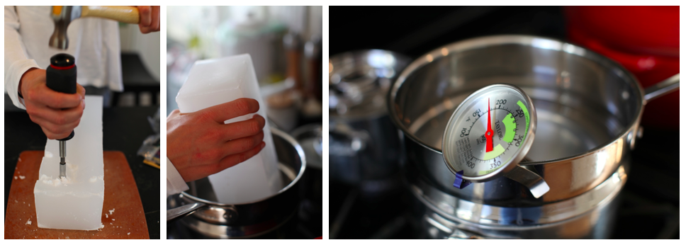My friend Mary came by and helped me out. We gave up trying to chisel off the wax and just threw the whole bar of wax in the double boiler. It didn’t take very long to melt down. Then it was simply adding in some dye wax and pouring it into the molds.