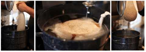 After bringing about 3.5 gallons of water up to 160 degrees we added in grains for flavoring and coloring. The smell transported me back to horseback riding as a kid and the smell of the horse food in the barns. It is pretty much like brewing up a big pot of horse food tea at this point.