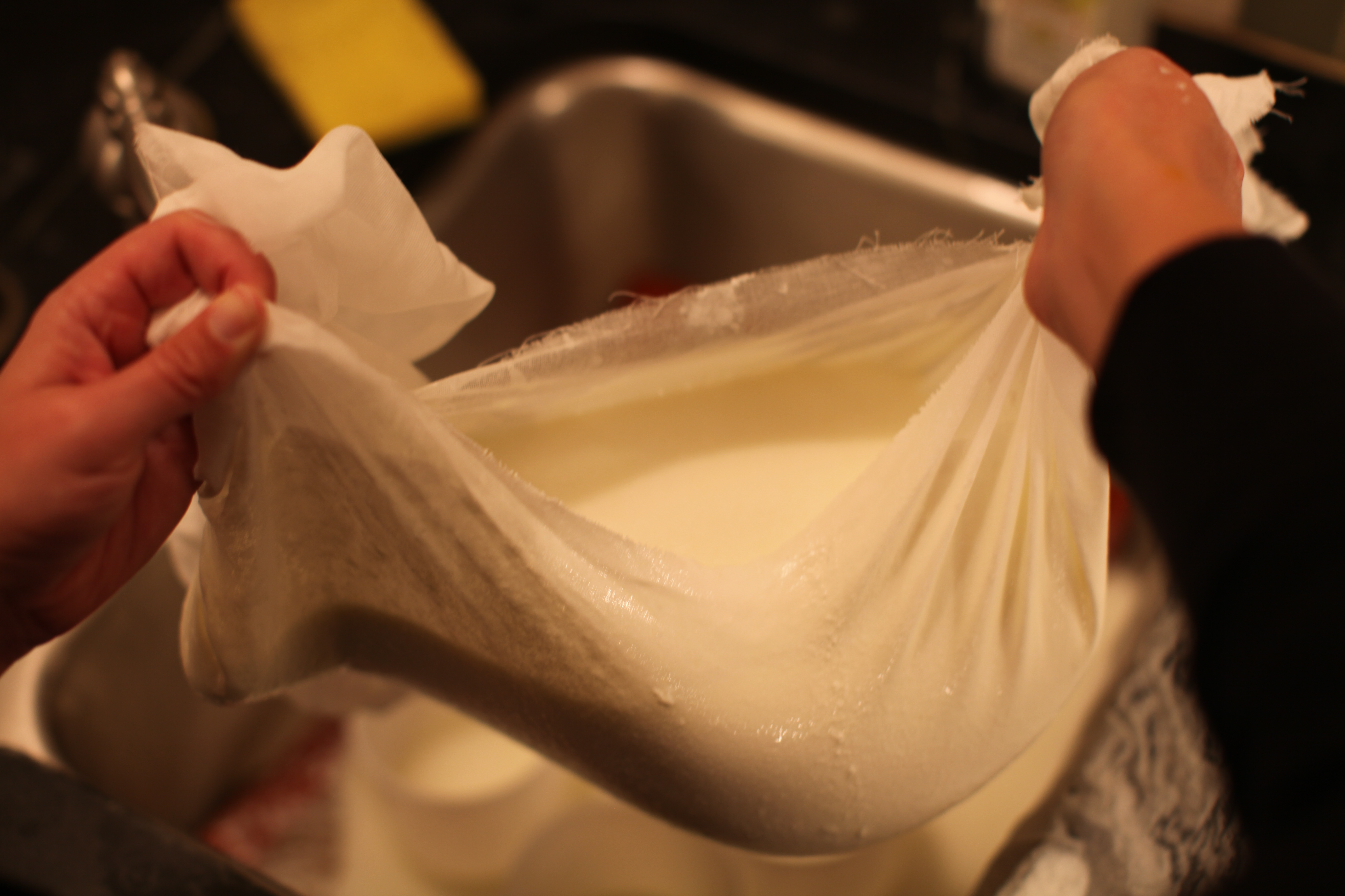 My husband helped me pour the curds and whey into a large cheesecloth so I could try to retain the stronger curd to pour into the moulds. When I visited Haystack creamery, they mentioned how slippery the bags of curd and whey were and I got to experience this firsthand. As I was trying to re-position the cheesecloth I lost one corner of it and half of the remaining mixture went into the sink and down my front side.