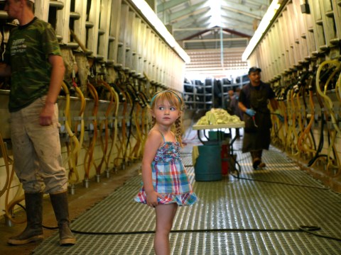 Dairy owner’s granddaughter in milking room in NE Colorado