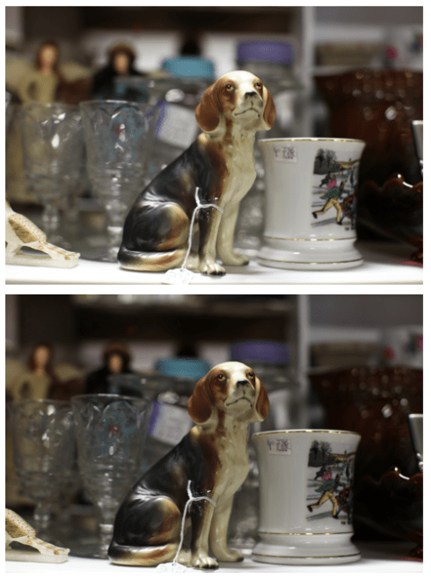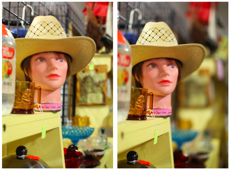 To practice a bit more with some of these features I went to the local flea market since there are always fun things to look at and to practice cutting through clutter. Here I was playing around with the background. Sadly this head was “NOT FOR SALE!” Who knows what her next assignment will be after she finds that cowboy hat an owner. Maybe she’ll be retired to a mantel above the fireplace.
