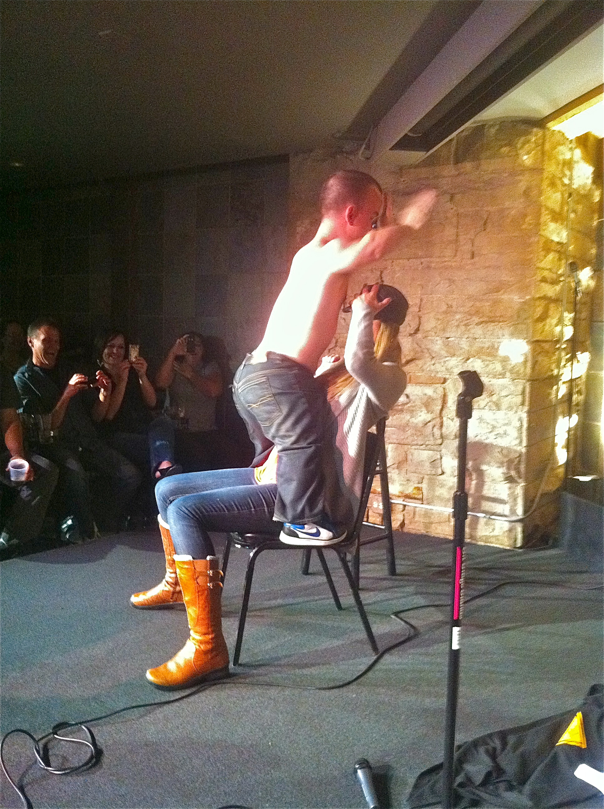 Last night, I decided to challenge my ban against laughing at little people and went to see Brad Williams perform at Comedy Works in Denver. He refers to himself as a dwarf and likes to “make humorous observations on disability, relationships, sex, and race”. He also likes giving lap dances as you can see. That is not me, by the way.