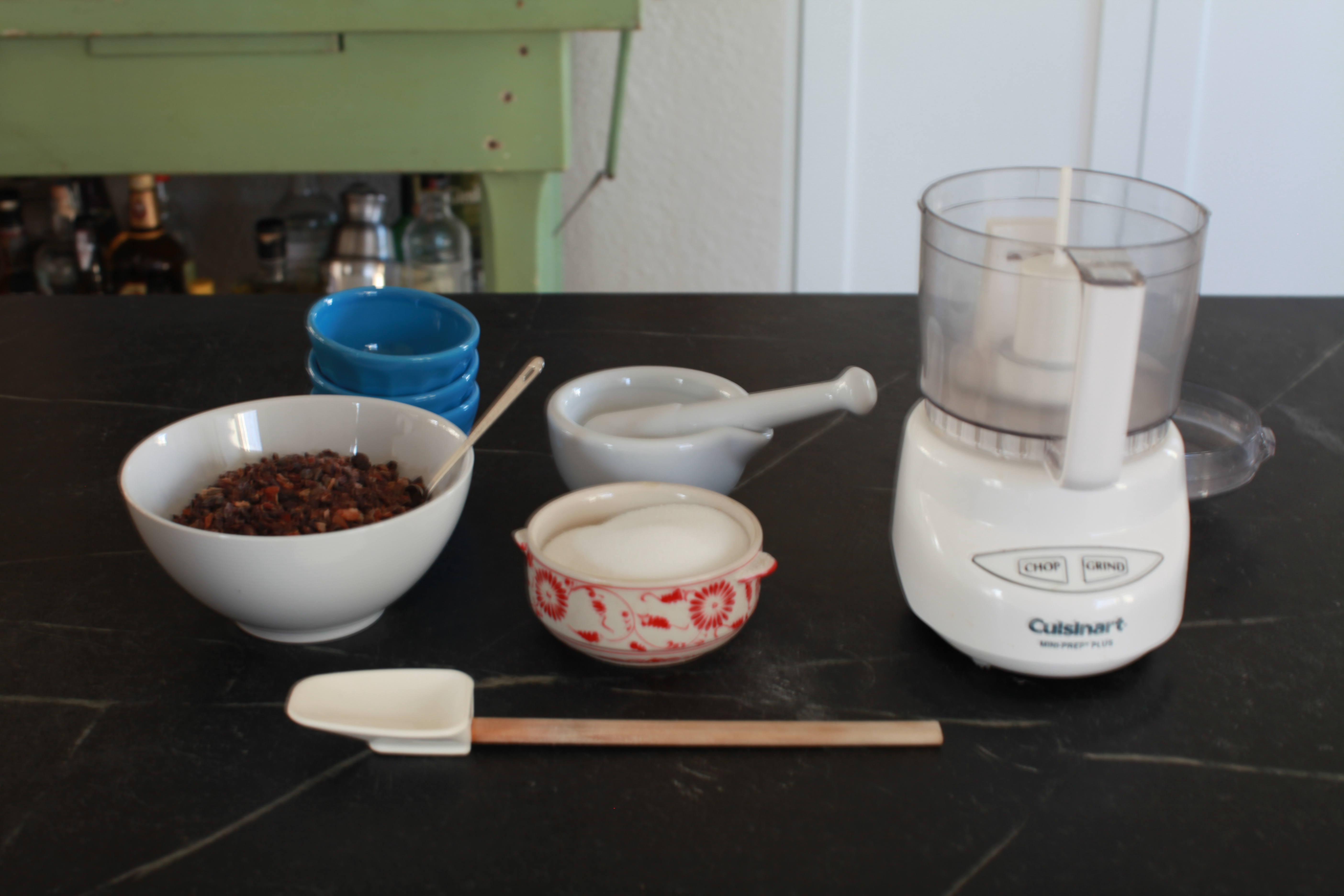 small coffee grinder – I used my small Cuisinart, but they recommend a simple burr coffee grinder. You want a grinder that keeps the nibs contained as it’s grinding rather than pushing it through to a compartment below because it has to grind for about 5 minutes.