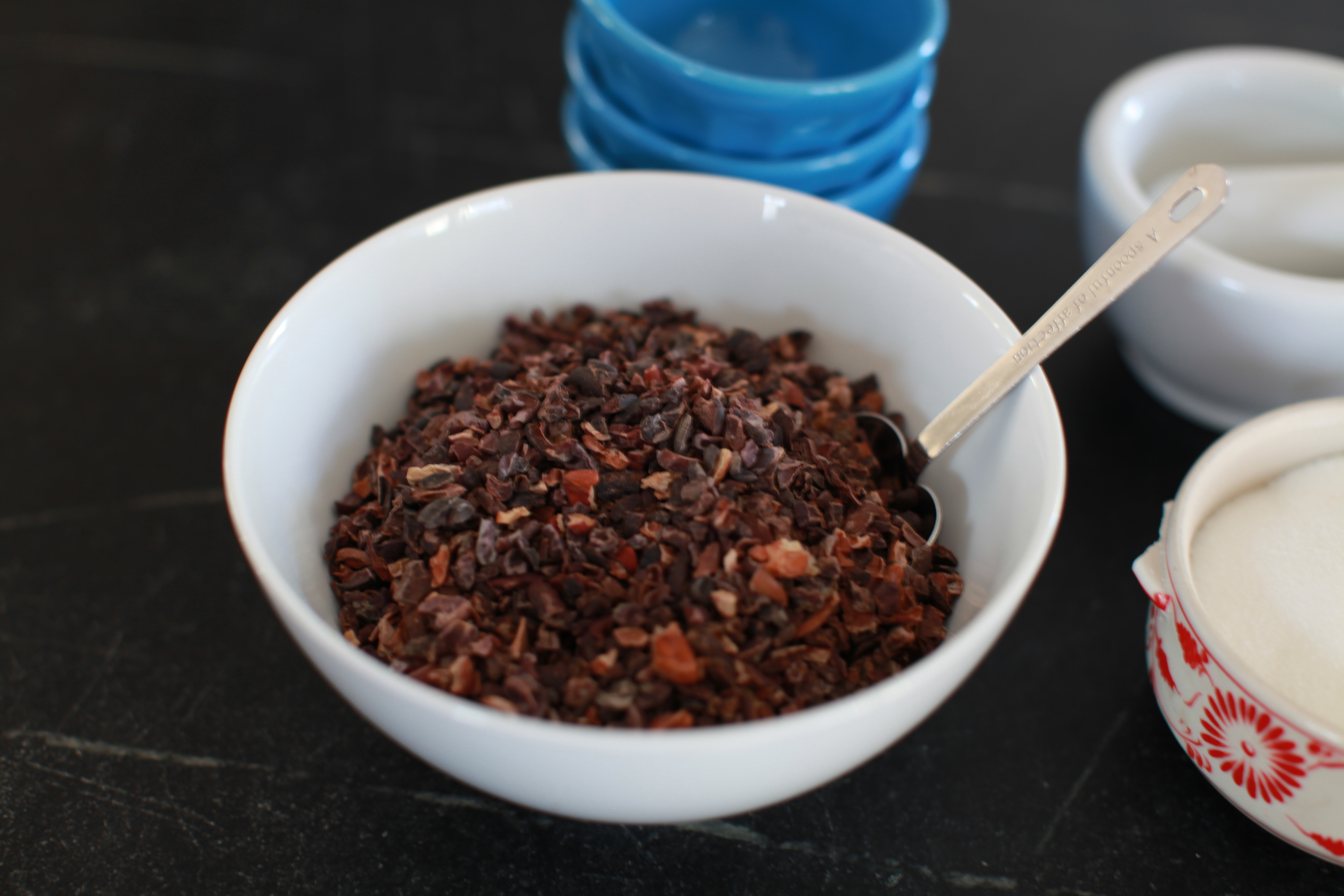 Start by adding the ratio of cacao nibs to sugar into the grinder. I started with 80%, so 8 teaspoons of cacao and 2 teaspoons of sugar.
