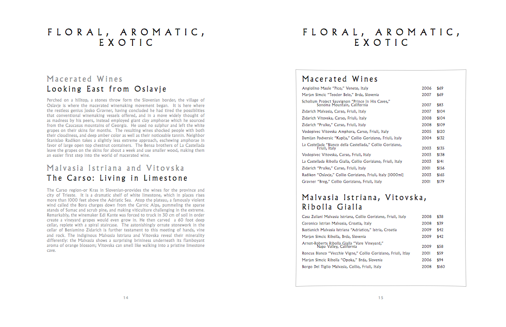 The list is organized by flavor profile, varietal and theme, giving people multiple ways to find a wine they might enjoy. The right side of the list is by varietal or flavor profile while the left side is by theme, offering a sommelier’s insight into what makes the wine special as well as wine making and historical tidbits. I found the section on macerated wines to be fascinating. If Matt weren’t a sommelier, he would make a great History professor.