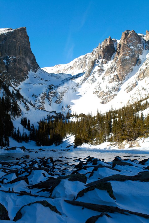 The snow had been on the ground for awhile so you could see lots of animal tracks from little mice to snow hares & deer. There was a pretty well established track, so getting up wasn’t bad. We snowshoed to a gorgeous lake called Dream Lake.